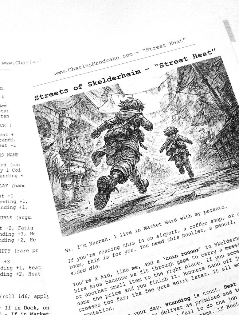 When you spend that many evenings in the same booth, you either talk yourself in circles or you make something. We started making these little one-die printable RPG games on napkins and index cards. They were simple enough to play between bites, and sharp enough to keep our heads working when the day was dull. Later, when Skelderheim gave us its own rhythms and rules, we rewrote them with that city in mind.